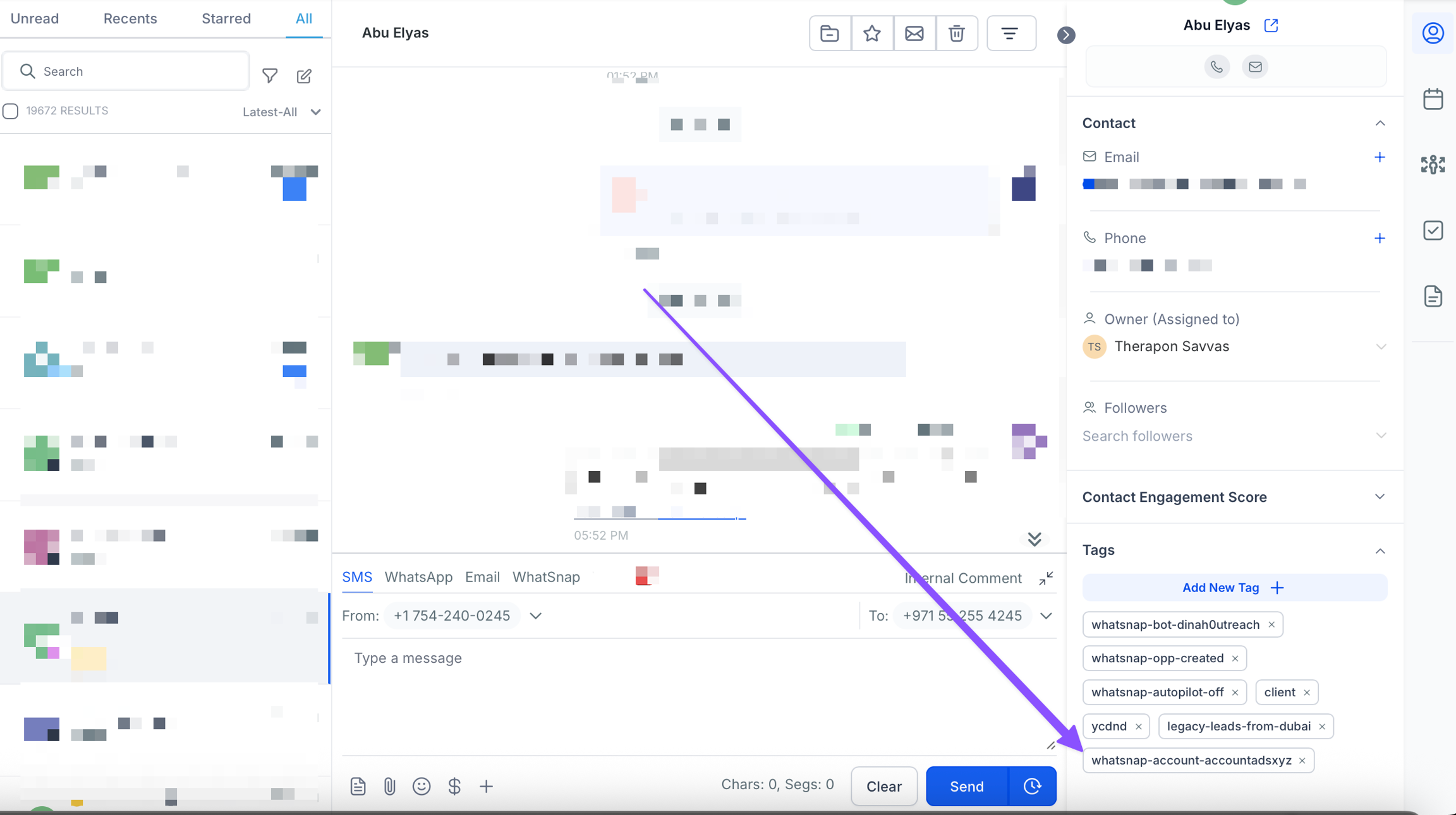 Example: If John has whatsnap-account-sales tag (WhatsApp) and then messages your support number via SMS/iMessage, his tag will automatically switch to whatsnap-account-support to ensure all future replies use the correct messaging account and platform.